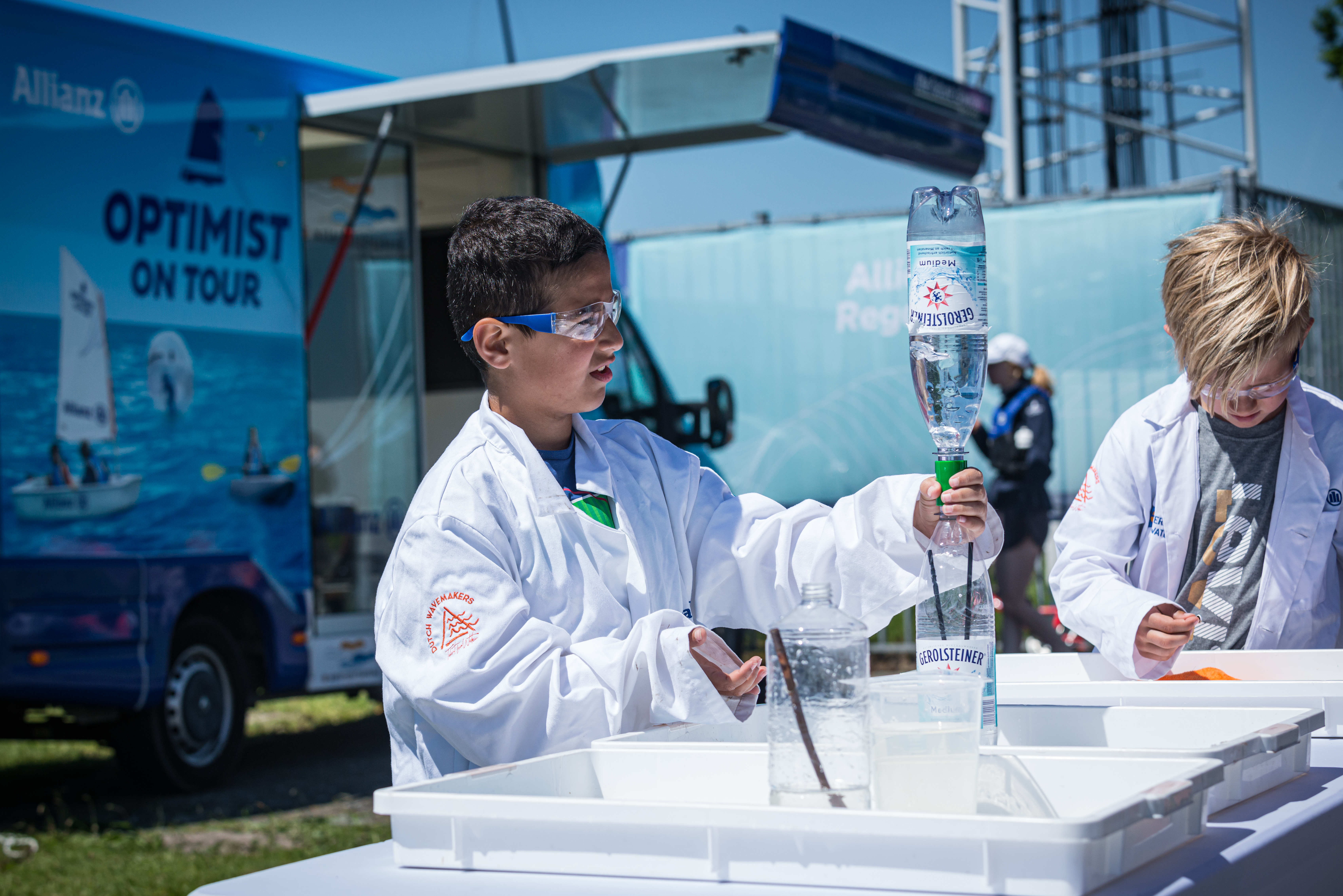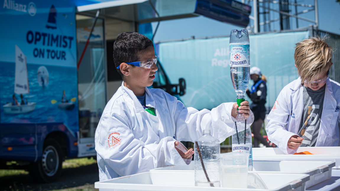 Niet alleen op het water, maar ook aan wal valt er genoeg te leren en te beleven. In het Optimist on Tour Waterlaboratorium kruipen kinderen in de huid van een onderzoeker en gaan ze zelf aan de slag met waterproefjes die laten zien waarom water zo’n grote rol speelt in onze leefomgeving en hoe we onze steden droog en leefbaar houden. Gehuld in witte labjas én veiligheidsbril experimenteren kinderen met de krachten van water en onderzoeken ze spelenderwijs hoe we ons kunnen aanpassen aan veranderende weersomstandigheden.