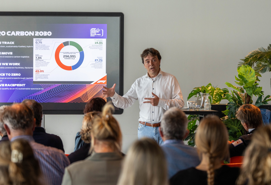 Dimitri Bonthuis liet zien hoe een groot sportevenement kan dienen als benchmark voor duurzame eventorganisatie. Het 75 jaar oude circuit van Zandvoort, omgeven door Natura 2000, was totaal niet geschikt voor moderne F1 en de logistiek van 100.000 bezoekers vormde een enorme uitdaging.