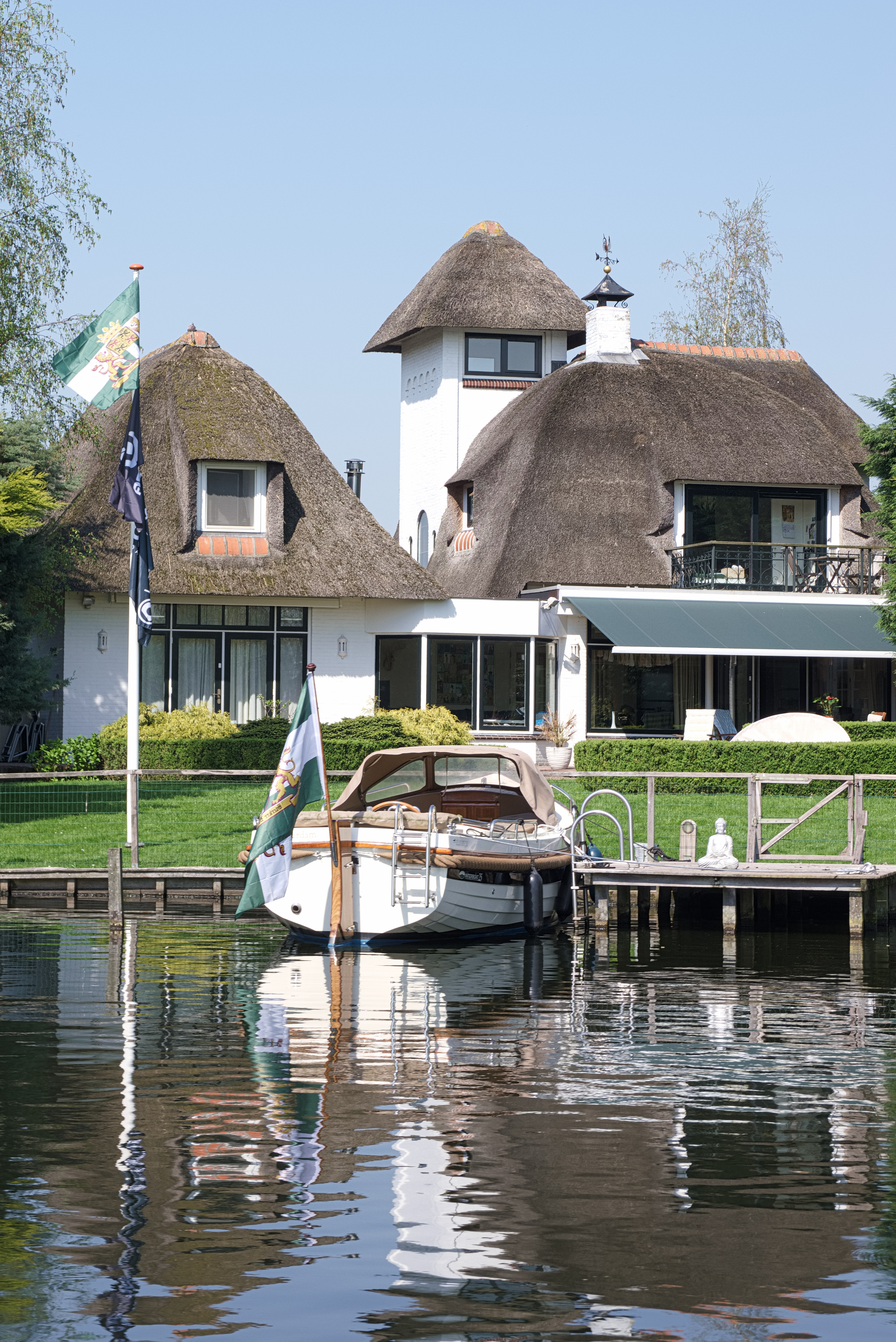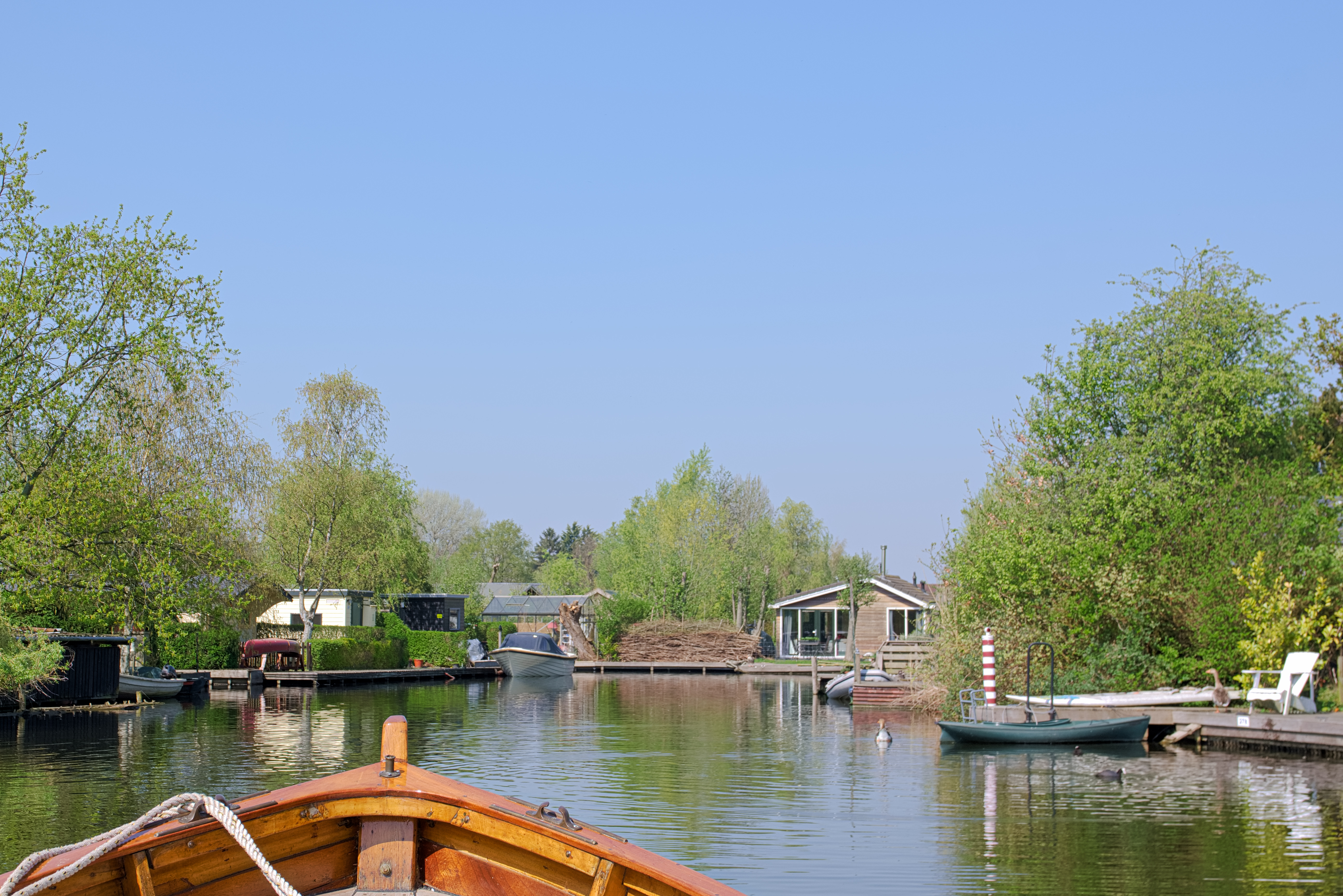 We zoeken in de zuidwestelijke hoek van de Voorplas het korte verbindingskanaal op. Om op de Achterplas te komen moeten we onder een vaste brug in de Straatweg door. Die blijkt ruim 2m hoog zodat we zelfs niet behoeven te bukken. We zijn nog niet onder deze brug door of we constateren dat we hier met een heel ander soort plas te maken hebben. Weliswaar heb je ook hier aan de randen van de plas veel luxe bebouwing, maar er is een opvallend verschil. Er liggen in deze plas een groot aantal eilanden. Daardoor lijkt deze plas veel meer op een voormalige veenplas dan de Voorplas. Bovendien zijn al die eilanden bebouwd met vakantie-optrekjes. Dat zijn de overblijfselen van wat vroeger kleine zomerhuisjes waren. Er zijn zo'n 200 van deze 'plashuisjes'. De ligging van de eilanden noodzaakt hier en daar tot het nemen van smalle doorgangen. Dat maakt het een ronduit knusse plas om te varen. Hier gaan we het wel een tijdje uithouden !