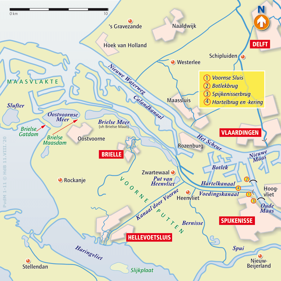 Naamgever van de rivier en nu het meer is vestingstad Brielle, ooit de vijfde stad van het gewest Holland. Op een luchtfoto of kaart kun je het kenmerkende sterpatroon van de stadswallen en verdedigingsgrachten niet missen. De stadswallen, aangelegd volgens het oud-Nederlandse vestingstelsel, zijn nog volledig intact. Daarmee is Den Briel de best bewaarde vestingstad van ons land. De inname van Brielle door de watergeuzen markeerde het begin van de opstand tegen Filips II. Feitelijk is 1 april 1572 daarmee de geboortedatum van de Republiek der Zeven Verenigde Nederlanden.