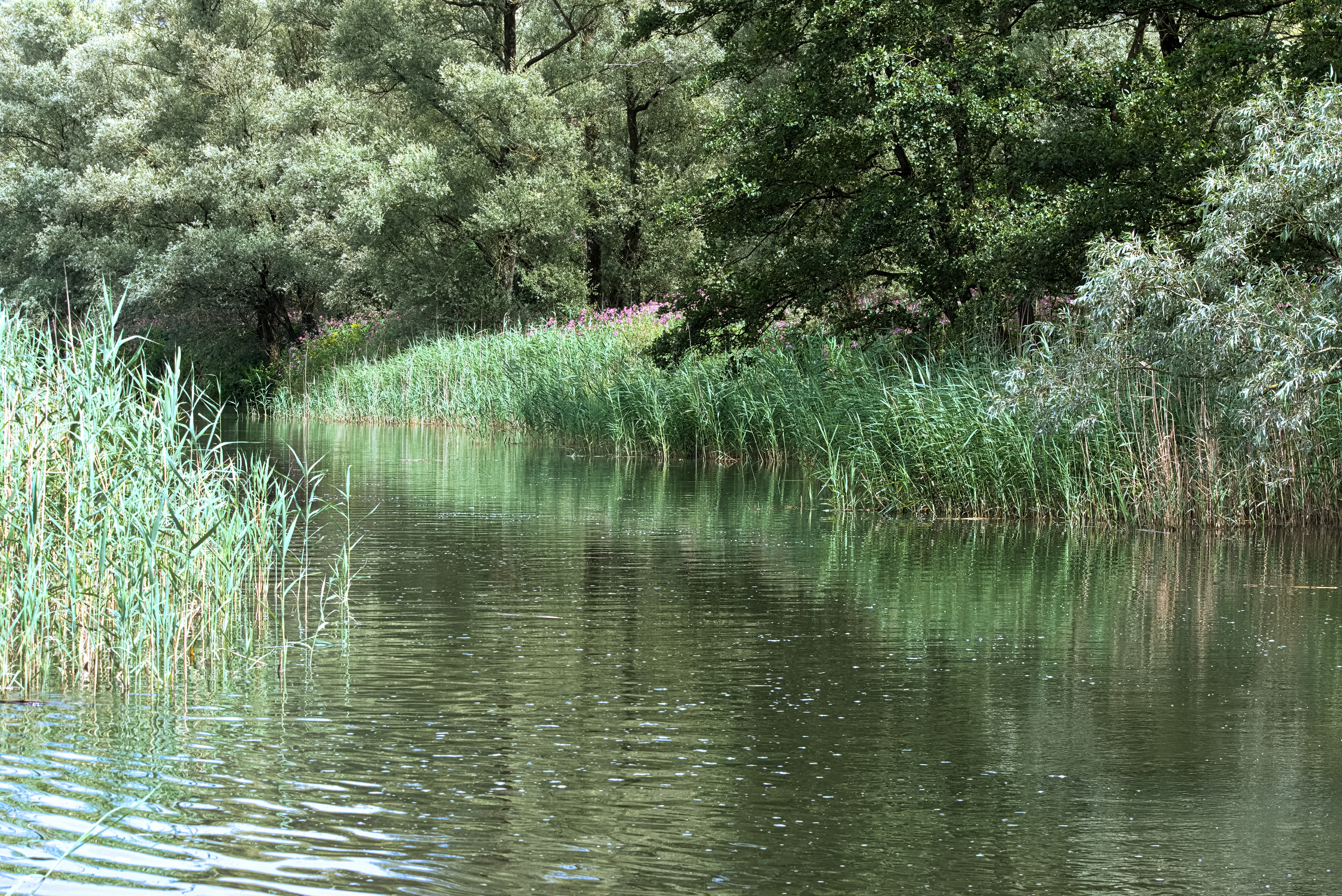We gaan stuurboord uit de Ruigt op en letten goed op de diepte, omdat er een paar ondiepten op de kaart staan aangegeven. Kort daarna gaan we bakboord uit onze eerste kreek in, het Buiten Kooigat. Binnen de kortste keren wordt de vaarweg spannend smal. De aangegeven diepte is 0m70 en we hopen maar dat dit water er ook echt staat. Inge vraagt op de kreken de dieselmotor uit te zetten en de elektromotor te gebruiken. Met alleen het geluid van kabbelend water varen we genietend langs de indrukwekkende hagen van roze balsemien en gele walstro.