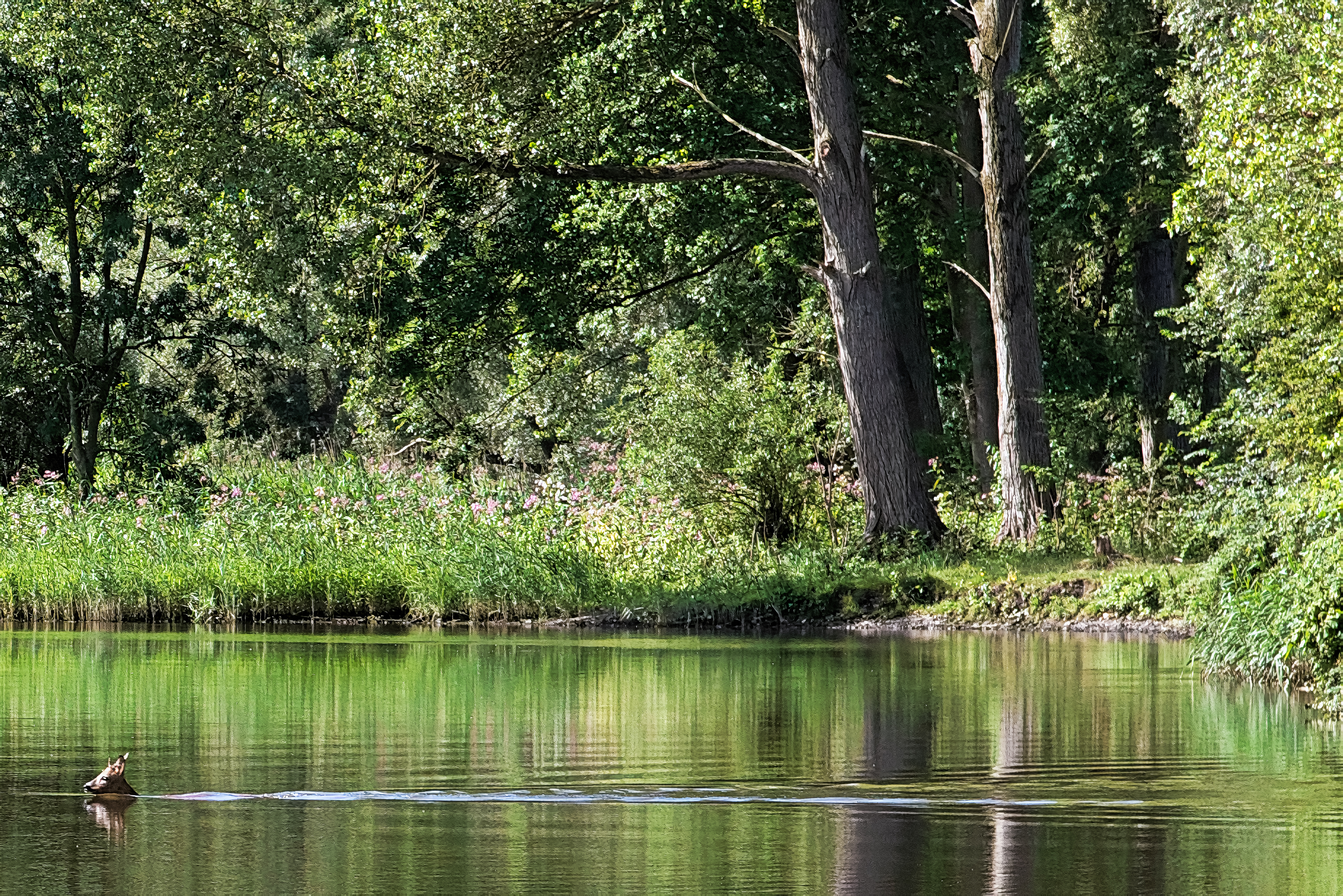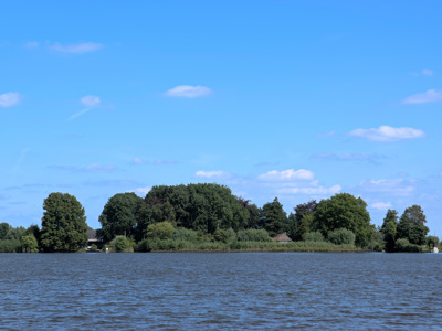 We zoeken de Sloot beneden Petrus op en varen die fluisterend door. Volgens Inge is dit bevergebied bij uitstek. We turen ons het hele eind suf, maar een ontmoeting blijft uit. Wat ons al varend opvalt is dat er opeens erg veel vogels de lucht in vliegen. Inge zegt : 'Opletten hoor, want dan is er waarschijnlijk een arend in de lucht. Er zitten hier een aantal zeearenden-paren. Er er zijn ook een aantal broedparen van de visarend. Arenden zijn indrukwekkend grote vogels!'. Heel hoog zien we iets groots traag rondcirkelen. We proberen het tevergeefs met de telelens vast te leggen. We besluiten dat dat er wel één geweest moet zijn. Op het Gat van de Stek heeft ons fluistervaren een bijzonder gevolg. Een ree dat ons niet heeft gehoord laat zich in het water zakken en zwemt voor onze boot het Gat over. Onze camera's klikken en maken daarbij meer geluid dan de boot. Gewaarschuwd zoekt het ree de kant op en verdwijnt in de begroeiing. Inge is vergenoegd : 'Daar mogen we niet over klagen, zeg. Op klaarlichte dag zie je zo'n ree niet al te vaak!'