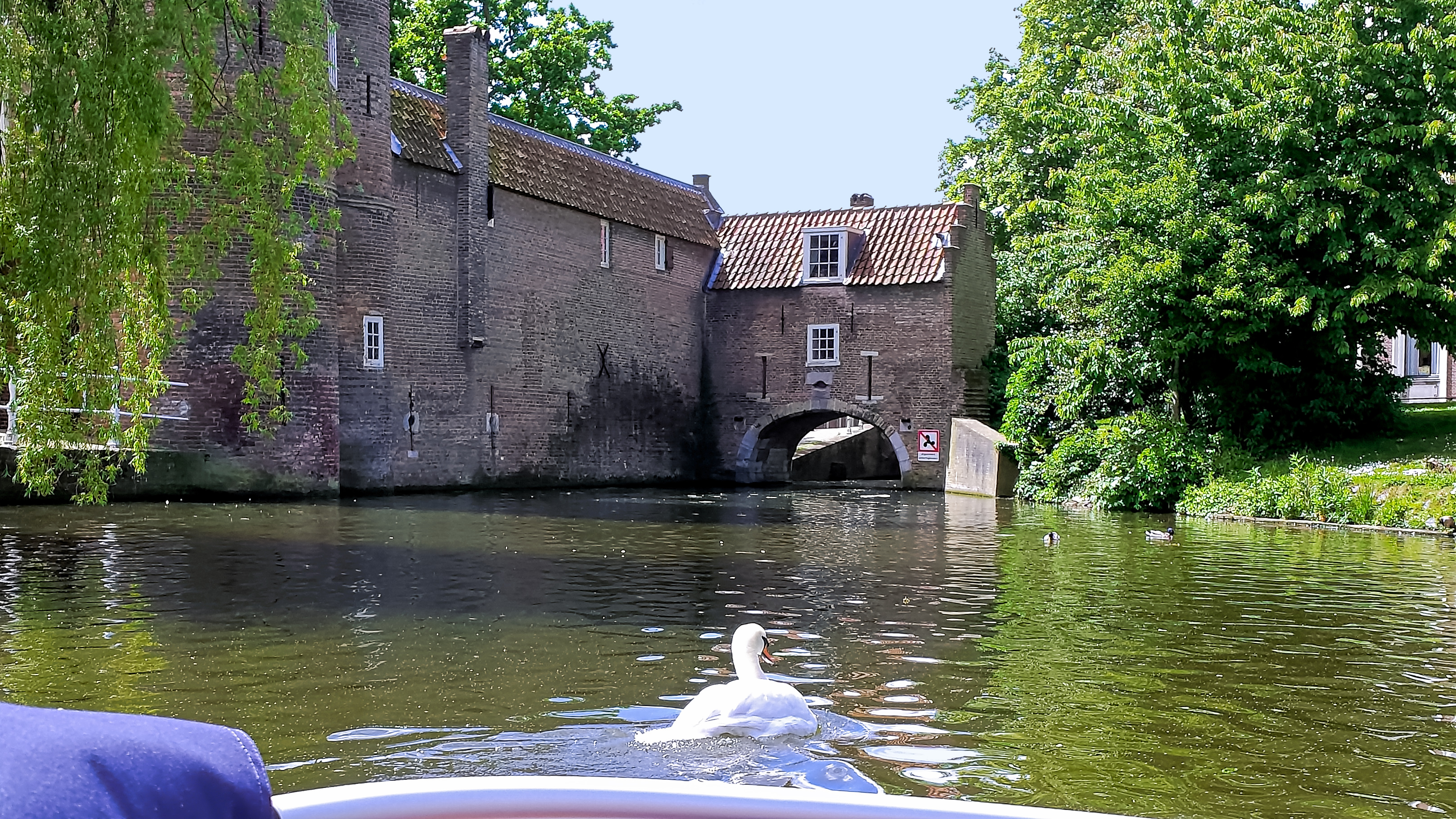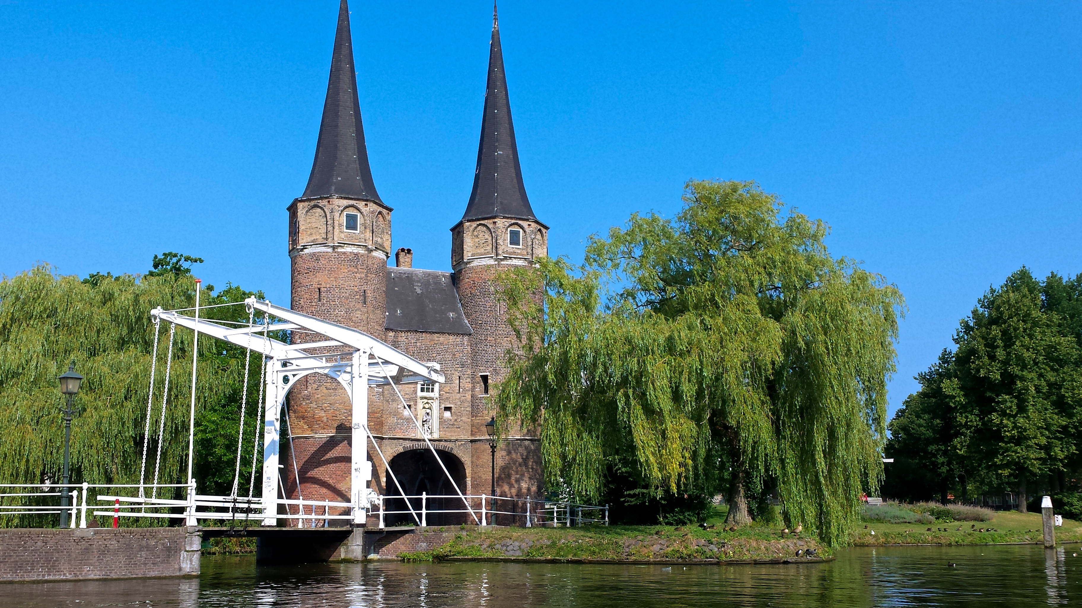 Het Rijn-Schiekanaal loopt dwars door de stad. Vroeger was het een onderdeel van de stadsverdedigingsgracht en was het de natuurlijke rand van de stad. Op de oude stadskaarten kun je zien dat de huidige loop eigenlijk niet veel afwijkt van vroeger. Dat merk je ook aan wat je er kunt zien. Komende vanaf Den Haag kom je twee bewaard gebleven waltorens uit de 16e eeuw tegen : de Sint Huybrechtstoren en de Rietveldse Toren. En verderop kom je bij de enige bewaard gebleven stadspoort, de Oostpoort. Dat is een combinatie van landpoort en waterpoort, met elkaar verbonden door een oude stadsmuur. De poort dateert van rond 1400.