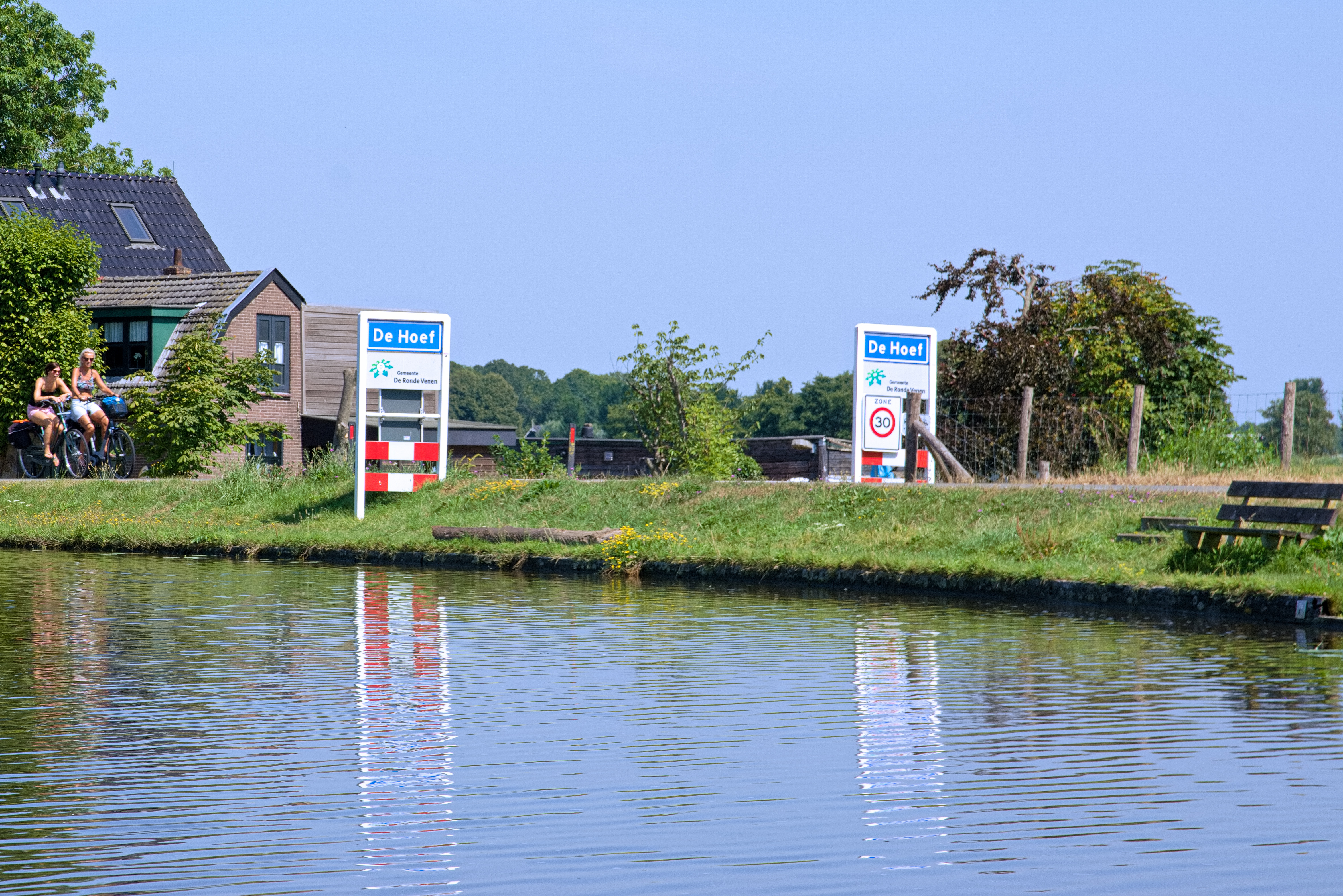 We kiezen voor de rest van de route de Kromme Mijdrecht en de Kerkvaart. Vooral de eerste doet op veel plaatsen qua natuurschoon niet onder voor de Grecht. Het is er eigenlijk een soort van look-a-like van. De wateralmanak heeft hier ook weer een mooie typering voor: 'landschappelijk vaarwater'. Met een weg ernaast en met iets meer bebouwing is het inderdaad minder 'eenzaam' dan de Grecht. Maar het blijft wel een prachtige vaarweg. We bereiken na verloop van tijd het bungalowpark Zomerlust. Daar is een opvallende dubbele fietsbrug aangelegd, waar we in het midden gemakkelijk onderdoor varen. Na nog een prachtig stuk vaarweg komen we door het plaatsje De Hoef. Het is rond lunchtijd en de aanlegsteiger bij een terras ziet er zo aantrekkelijk uit dat we de verleiding niet kunnen weerstaan.