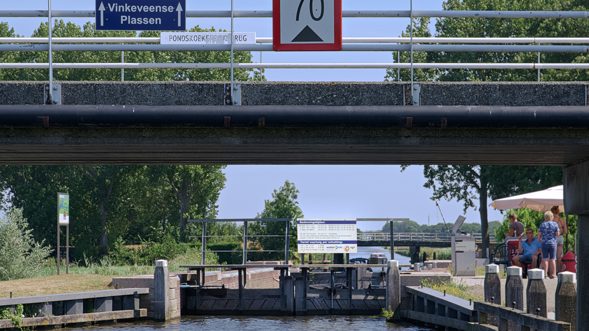 Als we enige tijd later verder varen, treffen we aan stuurboordzijde de Pondskoekersluis met een vaste brug daarvoor. De sluis schut naar de Kerkvaart en daar willen we heen. De sluiswachter is een gezellige tante : 'Ik ben een huisvrouw met een leuke baan. Ik ben in dienst van Waternet!'. Tegen het in deze regio gebruikelijke tarief laat ze ons een kleine 2m zakken. De Kerkvaart is een saaie, rechte vaart van 1km. In Mijdrecht draaien we stuurboord uit de Ringvaart van Groot Mijdrecht op. Blijkbaar varen hier wel eens mensen mis want er zijn heel erg duidelijke borden geplaatst waar de doorgaande vaarroute ligt. Mijdrechts eerste bewoners waren er al in de 11e eeuw. Er heeft in de Middeleeuwen een kasteel gestaan maar daar is later overheen gebouwd. En wel zo dat we de exacte locatie van het kasteel niet meer weten.