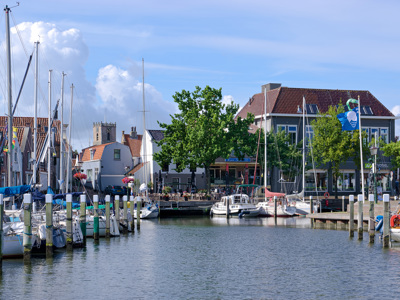 We varen urenlang het gehele meer over en kiezen een zodanige koers dat we het eiland Dwars in den weg aan stuurboord passeren. Gek genoeg hebben we van dat eiland nergens de oorsprong van de naam kunnen vinden. Nou kunnen we die vanzelfsprekend zelf ook wel bedenken : toen Brouwershaven nog een zeehaven was lag die zandbank voor de haven natuurlijk dwars in de weg. We varen door naar het havenhoofd van Brouwershaven. De havenmeesters willen aangeroepen worden op een kanaal dat onze marifoon niet machtig is. Door een luidspreker krijgen we een plaats gewezen om even aan te leggen. De entree van de haven is meer dan fraai te noemen. Met stadsrechten sinds 1403 is Brouwershaven echt een prachtig oud Zeeuws stadje. We gaan er lunchen en nemen ons voor de plaats ook nog een keer een specifiek bezoek te brengen.