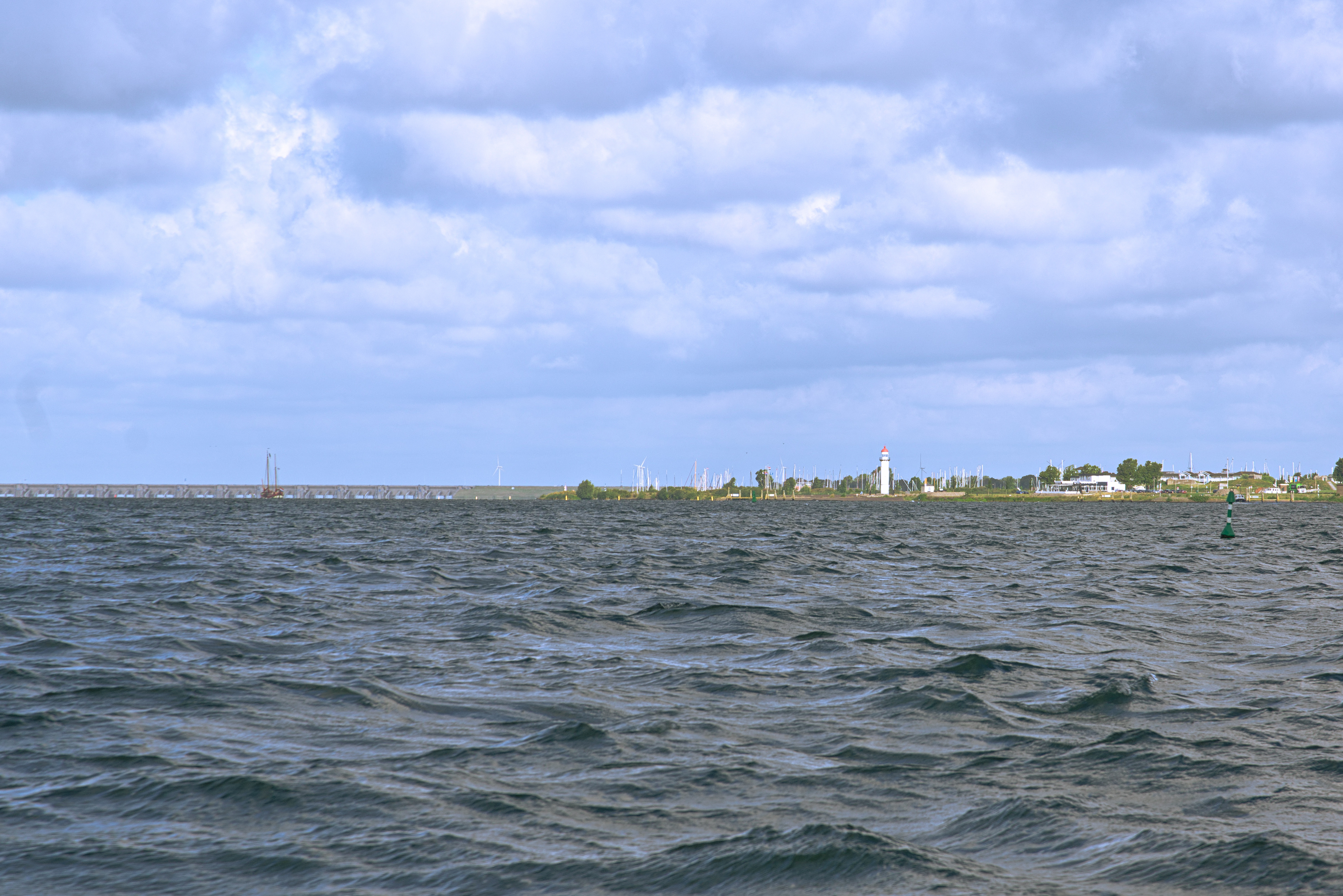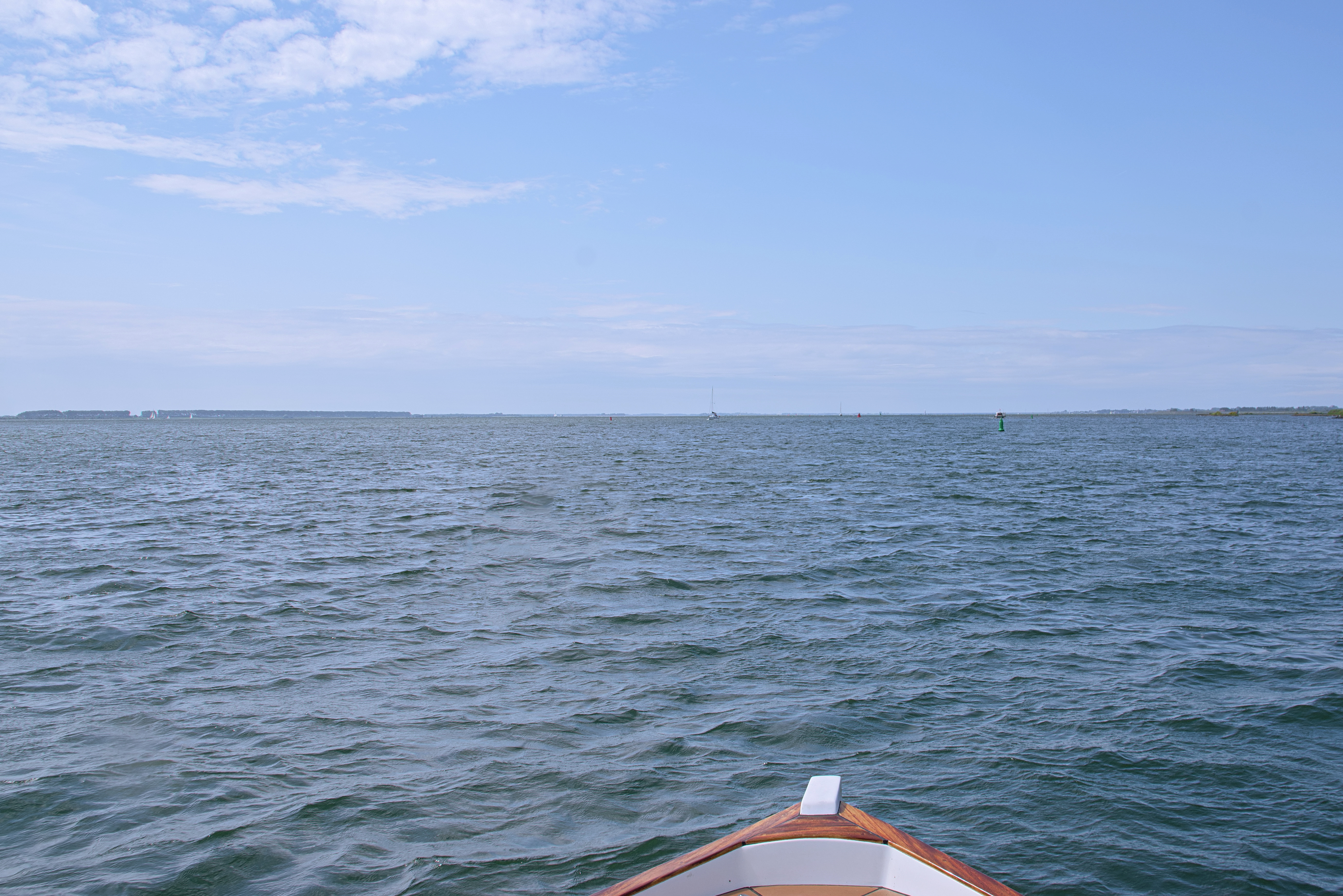 We varen het Haringvliet op ter hoogte van het Spui. Een kwartiertje verderop voelen we ons al volstrekt nietig ten opzichte van de enorme watervlakte om ons heen. Het waait flink, dus hadden we verwacht door zeilboten omringd te worden. Maar dat worden we helemaal niet, in ieder geval niet op de manier waarop we dat gewend zijn van plassen en meren. De zeilboten die er zijn vallen eveneens in het niet bij de watermassa waar we op varen. De wind waar de zeilers vrolijk van worden, bezorgt ons een natuurlijke douche. Het buiswater noodzaakt ons tot het opzetten van de kap over de voorkuip. Daarmee houdt je het binnen prima droog, maar het noopt wel tot staand sturen. Dat is voor de stuurman wat minder droog.
