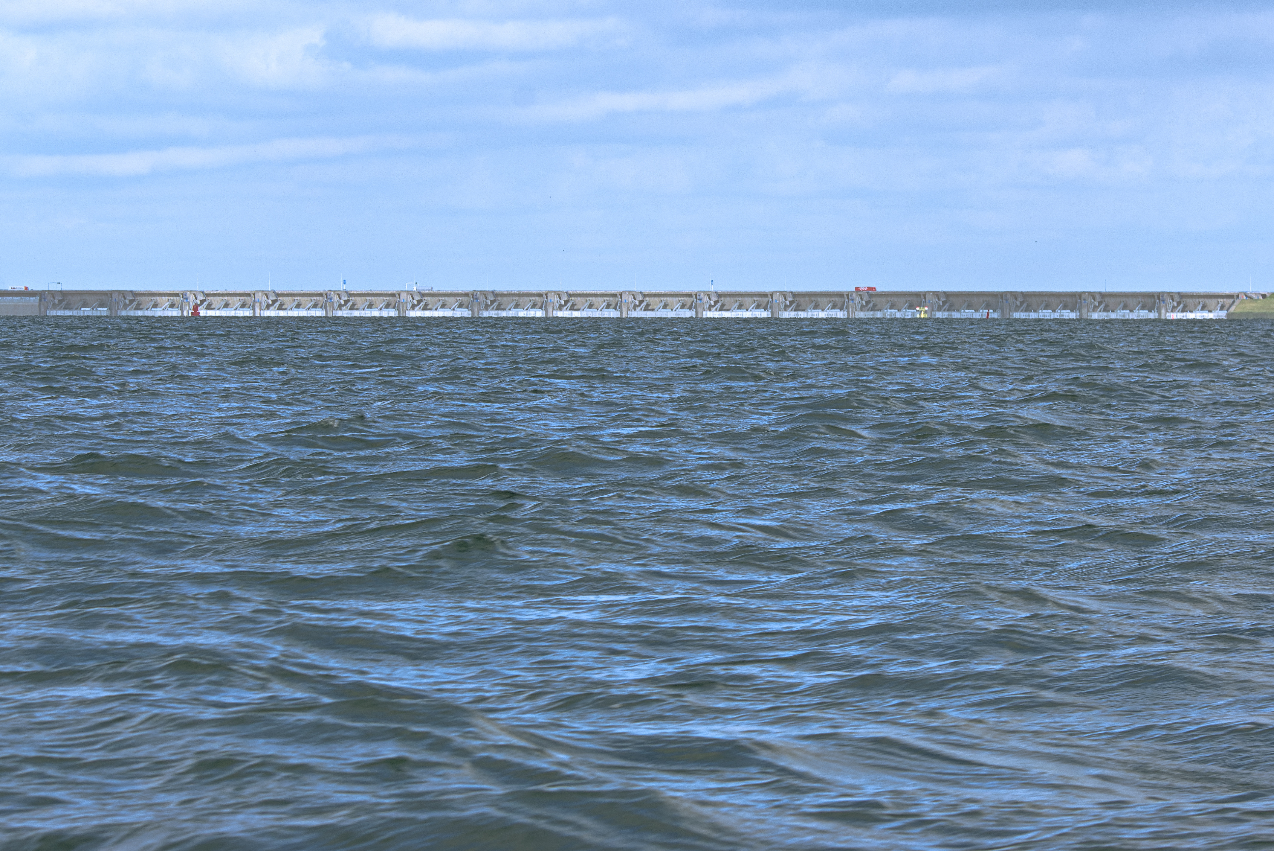 Vlak voordat we het havenkanaal invaren werpen we een blik op de Haringvlietdam. Dit zesde bouwwerk van de Deltawerken sluit het Haringvliet af van zee. Om overtollig water af te voeren bestaat 1km van de 5km lange dam uit een spuisluizencomplex. In dat gedeelte zitten 17 openingen.  Aan de bouw van de dam is begonnen 1958 en het geheel was in 1970 gereed.