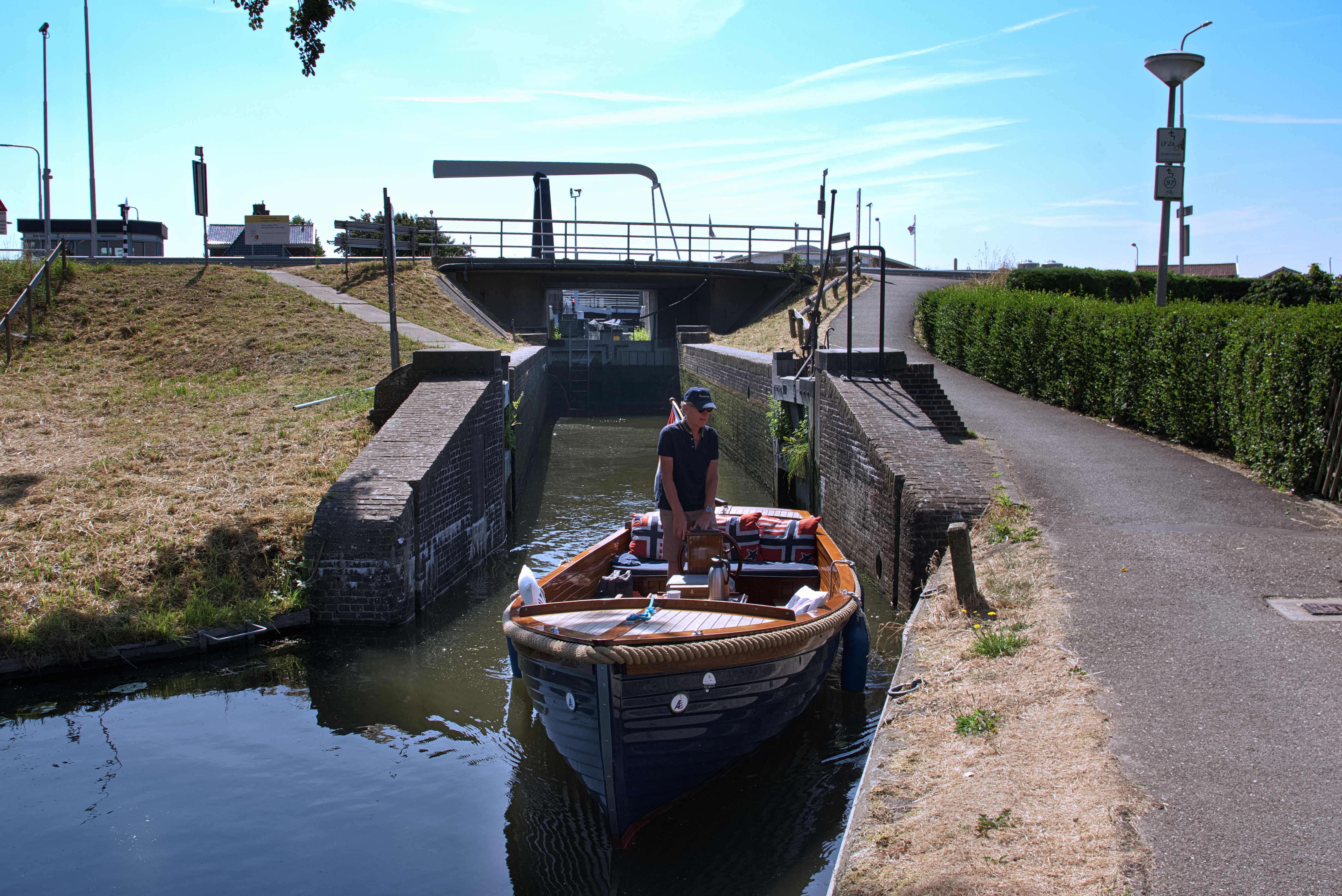 Je komt op de Langeraarse Plassen vanaf het Aarkanaal door een zelfbedieningssluis. De wateralmanak geeft het correct weer: 'de relatief smalle doorvaart van het sluisje, de toegangssloten en de vaste bruggen maken dat de afmetingen van de vaartuigen beperkt zijn. Met een gemiddelde sloep zijn de plassen goed bereikbaar'. Dat zijn we gaan proberen en het klopt. Sterker nog, de realiteit is zelfs veel leuker dan de beschrijving. Je blijkt namelijk heel verschillende soorten zelfbedieningssluizen te hebben. In tientallen jaren varen zijn ook wij eraan gewend geraakt dat 'zelfbediening' een hoog automatisch gehalte heeft. Meestal doe je zelf eigenlijk helemaal niets en druk je alleen maar op een knop. En juist dat gaat hier totaal anders!