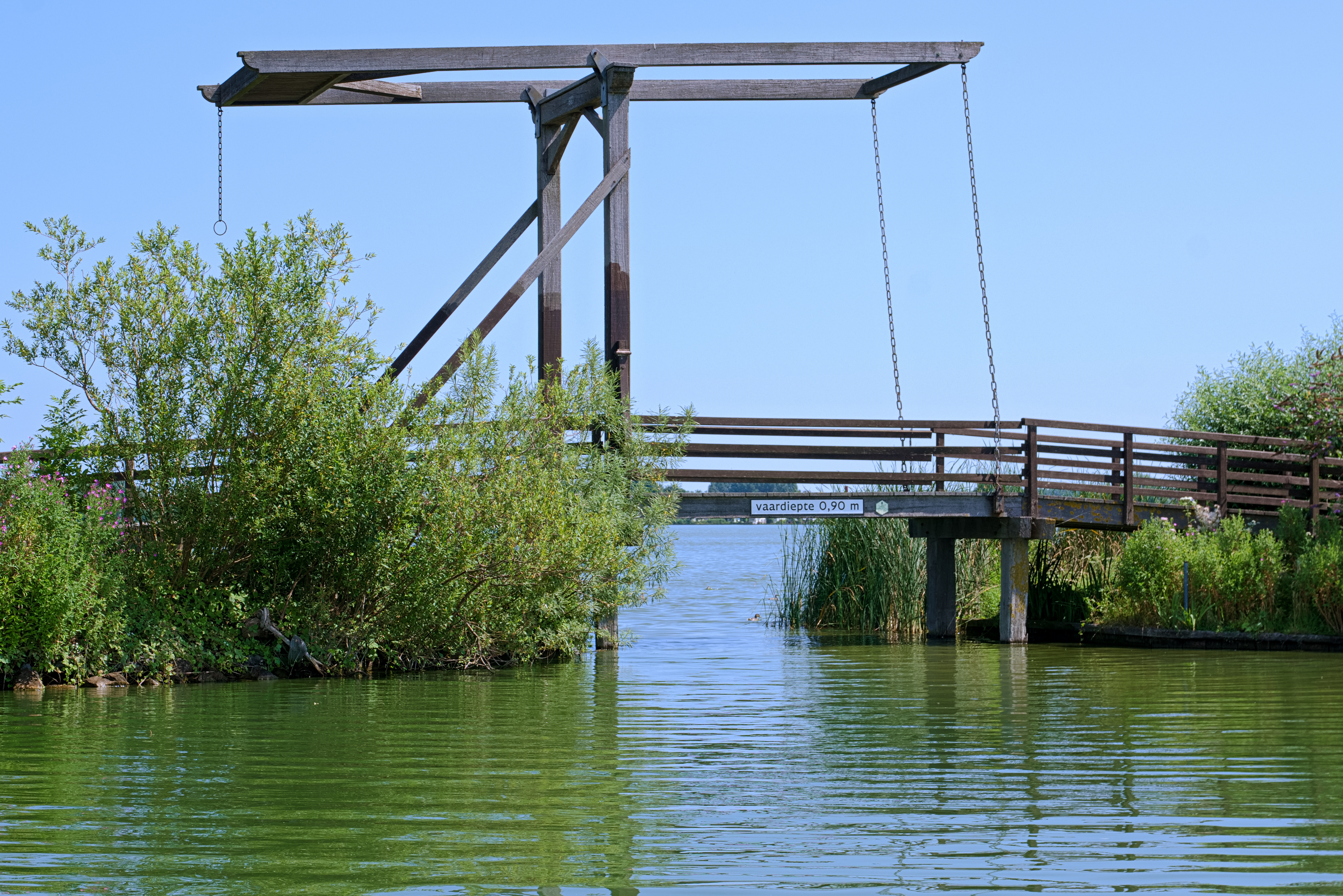 In het pad dat de Noordplas scheidt van de Zuidplas ligt een beweegbare brug. Op de brug wordt met een bord gewaarschuwd dat de vaardiepte er 0,9m is. Omdat de diepte verder op 2m ligt, is dat wellicht iets om rekening mee te houden. Op de Zuidplas ontwaren we zowaar een visbootje en een andere sloep. We varen ook deze plas op het gemak rond. Aan deze plas is de Watersportvereniging Langeraar gevestigd, de enige jachthaven van deze plassen. Als we na geruime tijd het Abel-Tasman-gevoel van ons af kunnen zetten keren we terug naar het sluisje. Wat een leuke plassen!