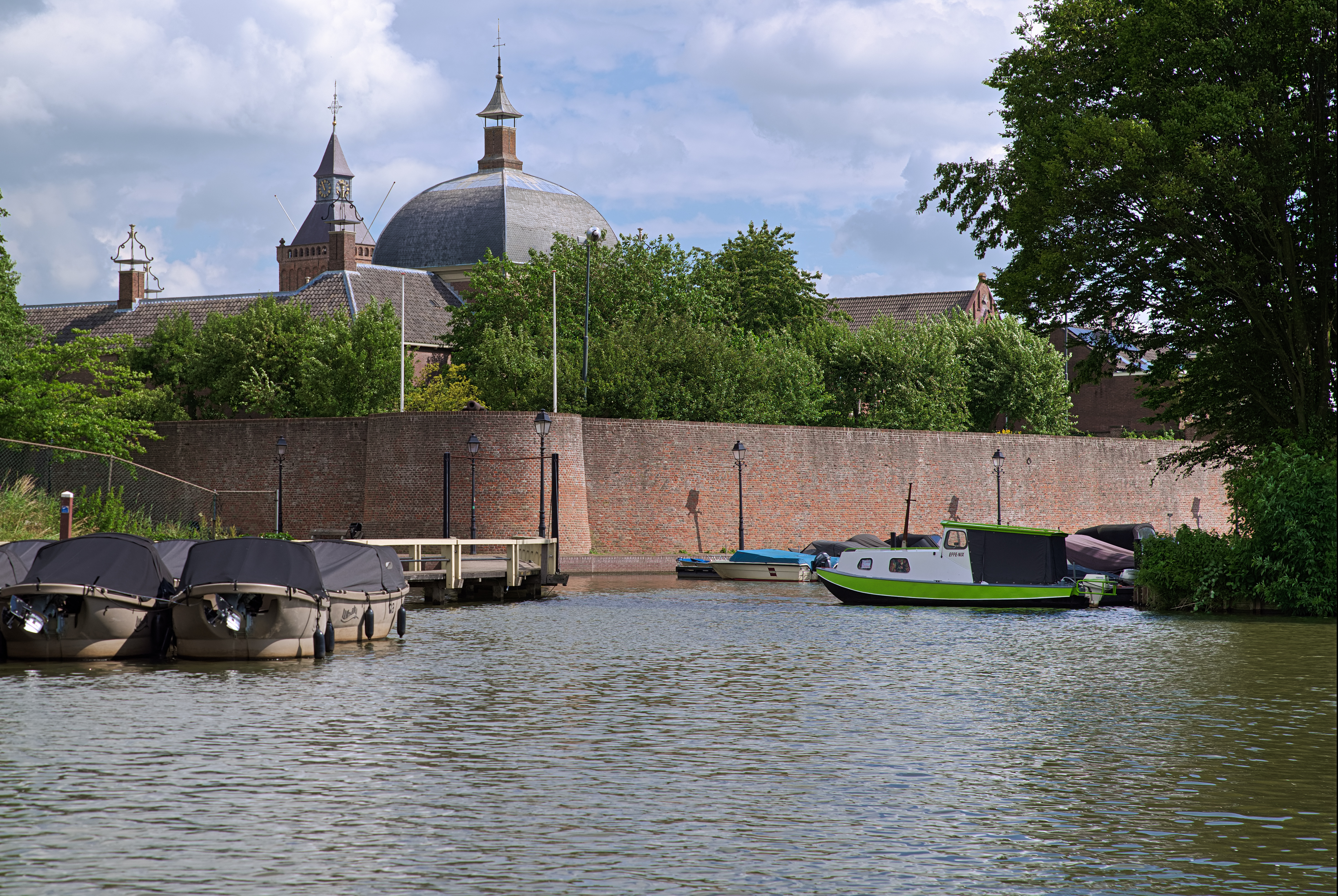 We varen door en vinden de vaarweg tussen Heukelum en Leerdam onverminderd landelijk. Net als we ons af beginnen te vragen hoe ze hier het nieuwe geld van de oevers hebben weten te weren, komen we een prachtig optrekje tegen. We verlekkeren ons er even aan en krijgen sportieve neigingen van de bijbehorende, eigen tennisbanen. Daarna komen we door de glasindustrie -waaraan Leerdam al eeuwen zijn bekendheid dankt - en passeren een overslagstation voor zand en grind. Al snel opent zich het zicht op de overgebleven en gerestaureerde stadsmuren van de Zuidwal. Het Kasteel van Leerdam is door de Spanjaarden verwoest in 1574. Op de plaats daarvan is in de 18e eeuw het Hofje van Mevrouw Van Aerden gebouwd. Het dak daarvan torent uit boven de stadsmuur en hetzelfde geldt voor de 13e-eeuwse toren van de grote kerk daarachter.