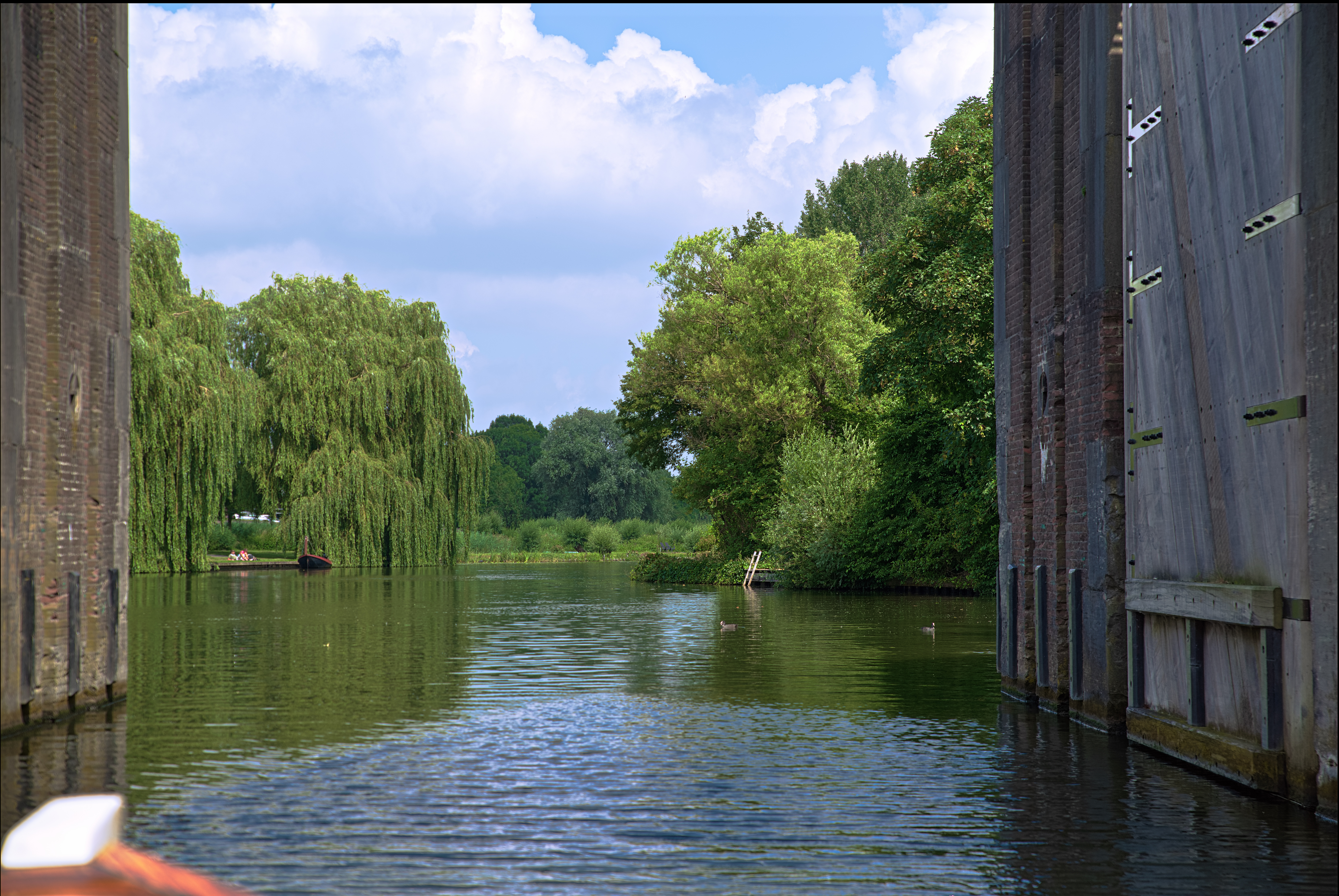 Vrijwel tegen Leerdam aan ligt Asperen. Met stadsrechten sinds 1314 en in de oudheid nog Romeinse bewoning is ook dit weer een stadje om van te watertanden. Maar wij hebben vooral oog voor het sluizencomplex. De sluizen liggen aan een soort van slingerweg en er liggen bruggen over op bijna 6 meter hoogte. Dat maakt dat de sluizen er massief en dus indrukwekkend uitzien. Ze dateren uit 1809 en zijn fraai gerestaureerd. Van oudsher waren ze ook nog uitgerust met waaiertechniek en speelden ze een rol in de Hollandse waterlinie, dus is het geen wonder dat het Rijksmonumenten zijn. We varen een paar extra rondjes om van deze bijzondere sluizen te genieten. Als we ze voldoende op ons hebben laten inwerken varen we er doorheen.