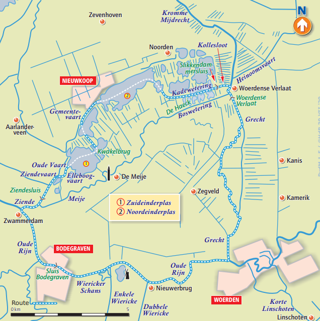 We steken de Zuideinderplas schuin over in de richting van de Kwakelbrug. Dit is een zelfbedieningsbrug, voor het geval je kruiphoogte boven 2m80 ligt. Dan moet je wel – tegen betaling - de code hebben gekregen om het combinatieslot te openen. De Kwakelbrug ligt in het Oortjespad dat Nieuwkoop verbindt met het buurtschap De Meije. Het fiets- en wandelpad dankt zijn naam aan de tol (een oortje) die vroeger voor een passage werd geheven. Na de brug gaan we bakboord uit de Gemeentevaart op. Deze vaart verbindt de Zuideinder- met de Noordeinderplas en is een kleine 3 km lang. Aan het eind van de luxe bebouwing langs de Gemeentevaart bereiken we de Noordeinderplas. Dit is een wat langgerekte plas die loopt van Nieuwkoop naar het plaatsje Noorden. Op de plas komen zo af en toe wat veenbonken omhoog. Die zijn dus niet altijd gemarkeerd en dat maakt het varen hier wat spannender. We steken de plas in de lengte over en zorgen ervoor uit de buurt te blijven van de veenbonken. Als we de plas af varen naar de Kadewetering hebben we aan bakboordzijde de legakkers van Noorden.