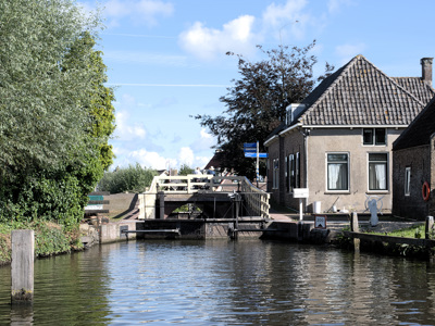 De eerste sluis van vandaag is de sluis Bodegraven in het hart van het dorp. We laten ons schutten en varen kalm door het dorp. Hoewel men altijd de inwoners van Gouda aanduidt als kaaskoppen, zou je dat ook met de Bodegravers kunnen doen : het dorp biedt plaats aan heel veel kaashandelaren. Als we het dorp verlaten, hebben we aan stuurboordzijde meteen het typerende landschap van Zuid-Holland : eindeloos weidegebied met koeien. Gerdien geniet ervan : ‘Die wolkenlucht zou zo van de schildersezel van Jacob van Ruisdael kunnen komen !’