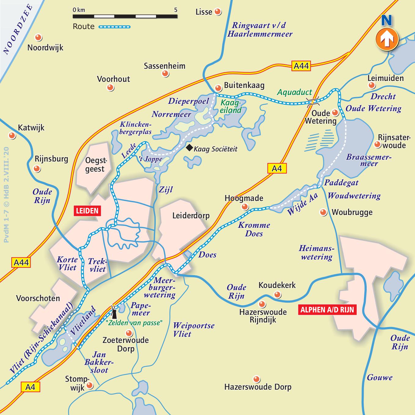 Vanaf de Kaag moeten we een keus maken hoe we naar Leiden willen varen. Rechtdoor via de Zijl is het kortst. Maar varen via de Warmonder Leede en de Haarlemmer Trekvaart is een aantrekkelijk alternatief. In Leiden komt die trekvaart uit op de Morssingel waarin 2 vaste bruggen liggen van 1m70. Als dat lukt, bepaalt je doorvaarthoogte de rest van het traject. Wat in ieder geval kan, is aan de westzijde om de stad heen. Je komt dan via het Korte Vlietkanaal uit op het Rijn-Schiekanaal. Maar misschien is je boot “laag” genoeg om over het Leidse grachtenstelsel te varen. Je kunt dan bijvoorbeeld via de Trekvliet naar het Rijn-Schiekanaal. Via de Zijl zou je – almaar rechtdoor varend – ook op dit punt zijn uitgekomen. En je bent op dit punt maar een paar kilometer verwijderd van Vlietland, waar we dit rondje zijn begonnen.