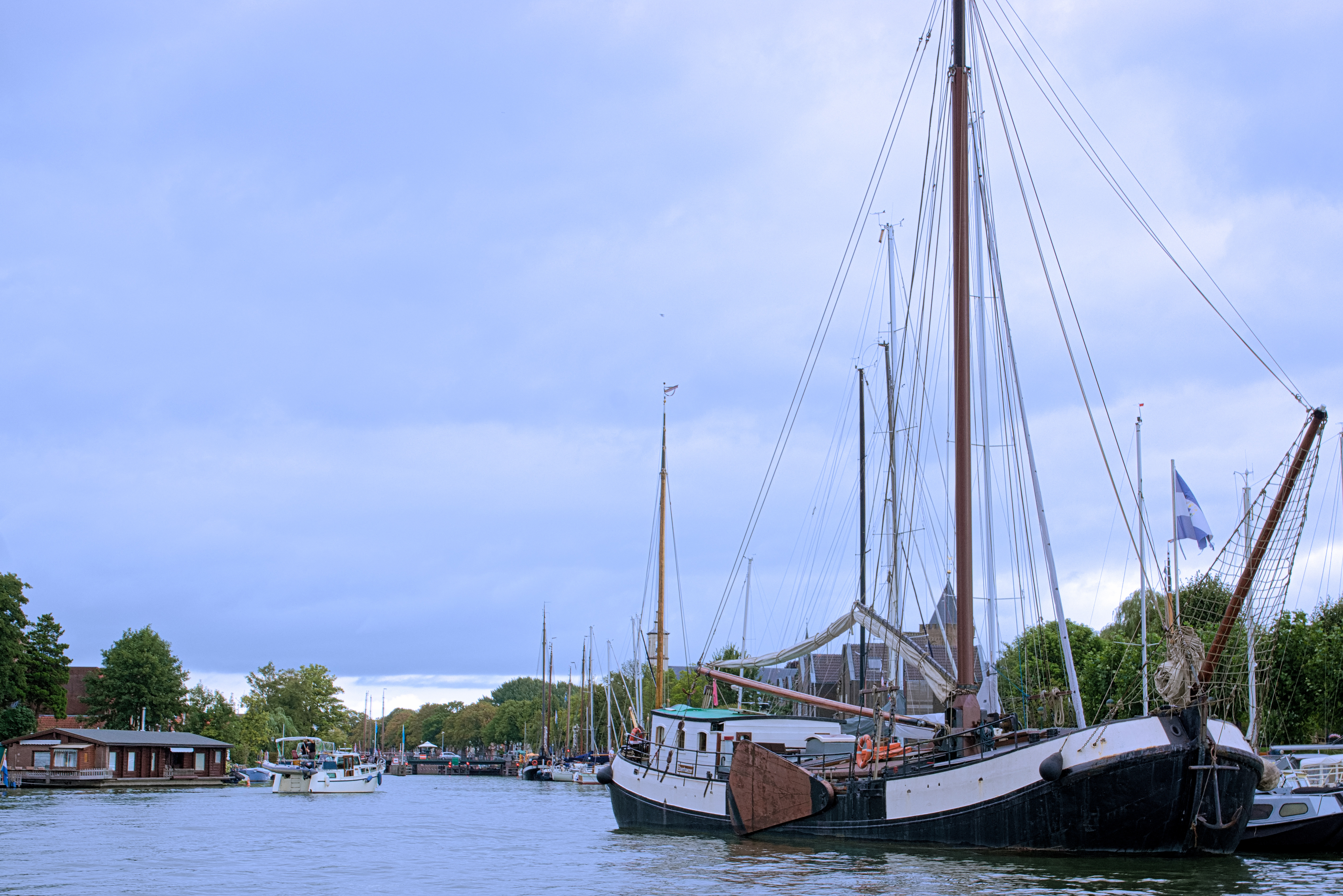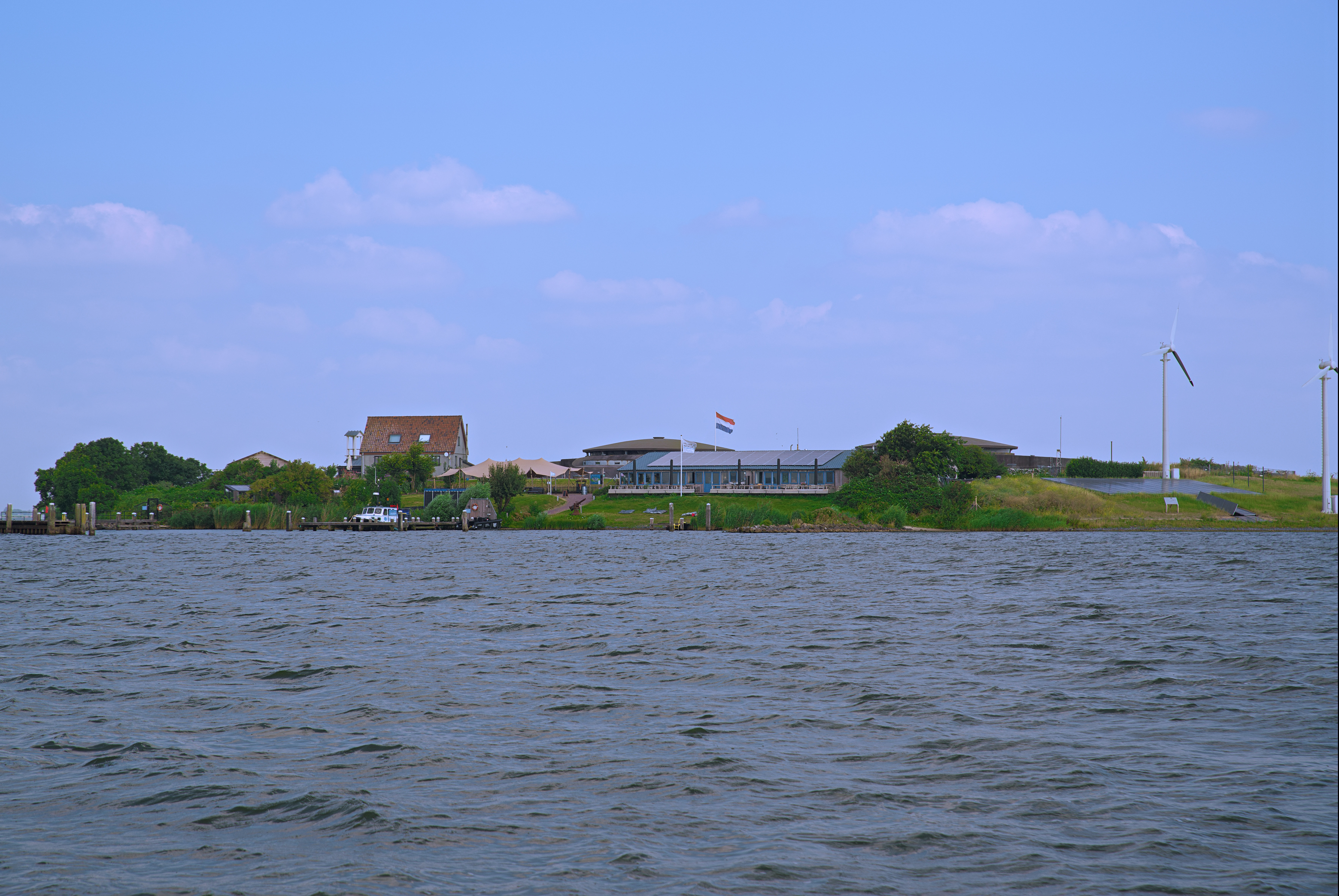 We vervolgen onze vaartocht in de vaargeul die ons uit de haven van Muiden leidt. Even later komen we op het IJmeer. Hoewel het nog een flink stuk verder is, kunnen we recht voor ons in de verte het eiland Pampus zien liggen. We varen daar rustig op aan. Aan stuurboord liggen dan de 3 eilandjes De Drost, Warenar en Hooft. We varen door en realiseren ons dat we toch wel op een serieuze watervlakte zitten. Het weer is een beetje dreigend en dat versterkt dat gevoel nog wat verder.
