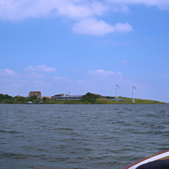 Als we ons rondje om Pampus maken, stellen we vast dat je het beter van bovenaf kunt bekijken. Officieel heet het eiland Fort aan het Pampus. Het is een kunstmatig forteiland dat is aangelegd in de jaren 1887-1895. Het is gebouwd om de Stelling van Amsterdam te completeren. Boeiend is dat het fort nooit voor gevechtshandelingen is gebruikt. Het is flink in verval geraakt door andersoortig gebruik. De Duitsers oefenden er in de oorlog mee voor precisiebombardementen. Ze sloopten de kanonnen en het staal voor de eigen oorlogsindustrie. Na de oorlog werd het gebruikt om munitie tot ontploffing te brengen. Sinds 1990 is het overgedragen aan de Stichting Forteiland Pampus. Er is heel veel puin geruimd, het fort is gerestaureerd en je kunt het tegenwoordig bezoeken. Het fort heeft anno nu een museale functie en er is een lunchrestaurant.